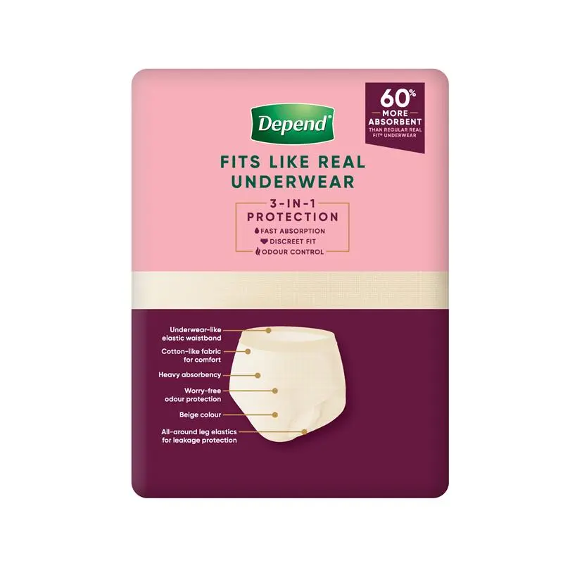 3-in-1 protection offers worry-free odour control, fast absorption and a discreet, comfortable fit. Depend® Real Fit® disposable underwear for women offers all day protection* that fits and feels like real underwear.
