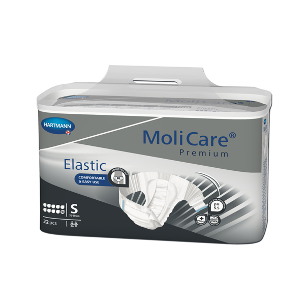 An all-in-one slip style pad for moderate to very severe incontinence, suitable for all body shapes. MoliCare Premium Elastic 10 Drops is self explanatory and quick and easy to apply with only 2 elasticated side panels and 2 re-closable tapes. Faster application and less handling helps preserve the dignity of patients, while the ergonomic design helps reduce stress on the body of care givers. MoliCare Premium Elastic Small offers maximum leakage protection, absorption perfomance and odour control for high level confidenece and security.