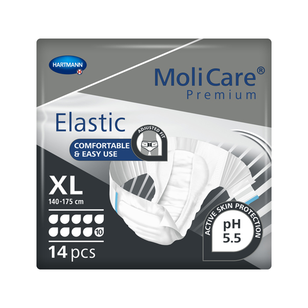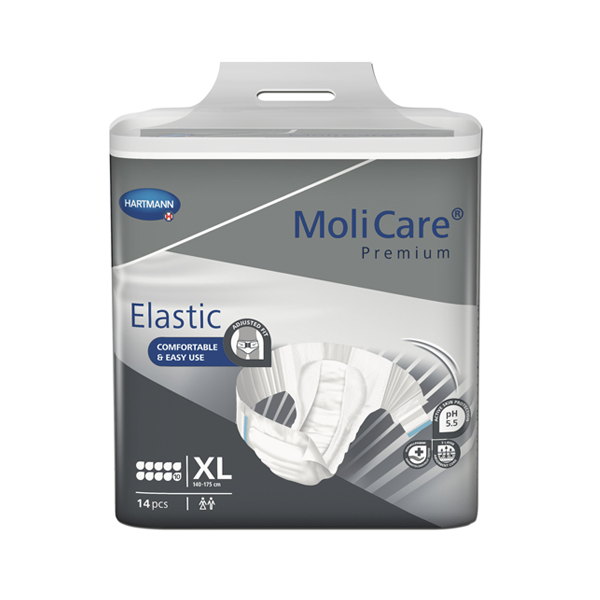 An all-in-one slip style pad for moderate to very severe incontinence, suitable for all body shapes. MoliCare Premium Elastic 10 Drops is self explanatory and quick and easy to apply with only 2 elasticated side panels and 2 re-closable tapes. Faster application and less handling helps preserve the dignity of patients, while the ergonomic design helps reduce stress on the body of care givers. MoliCare Premium Elastic XL offers maximum leakage protection, absorption perfomance and odour control for high level confidenece and security.