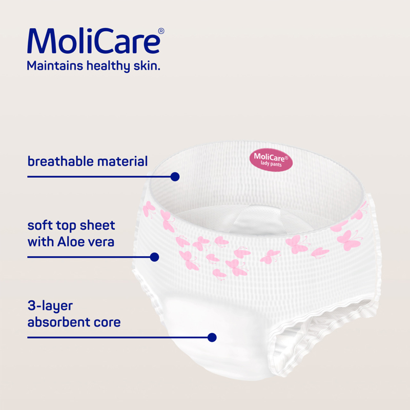 MoliCare® Premium lady pants 5 Drops look and feel like regular underwear and are ideal for light levels of bladder weakness. The pants contain skin friendly Aloe Vera as well as a 3-layer absorbent core that pulls fluid away from the surface, so the skin stays dry, healthy and free from odours. It also has advanced technology that helps to maintain the skin’s natural pH level and is important in reducing infection and skin irritation caused by incontinence.